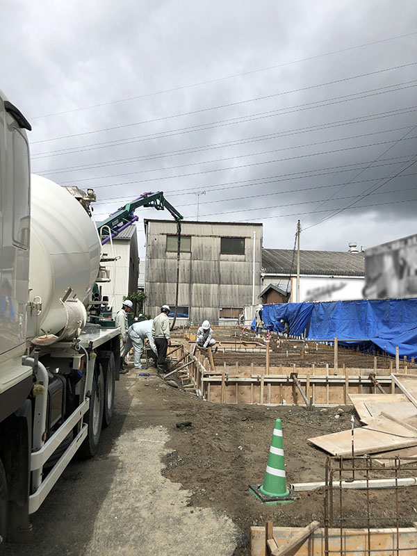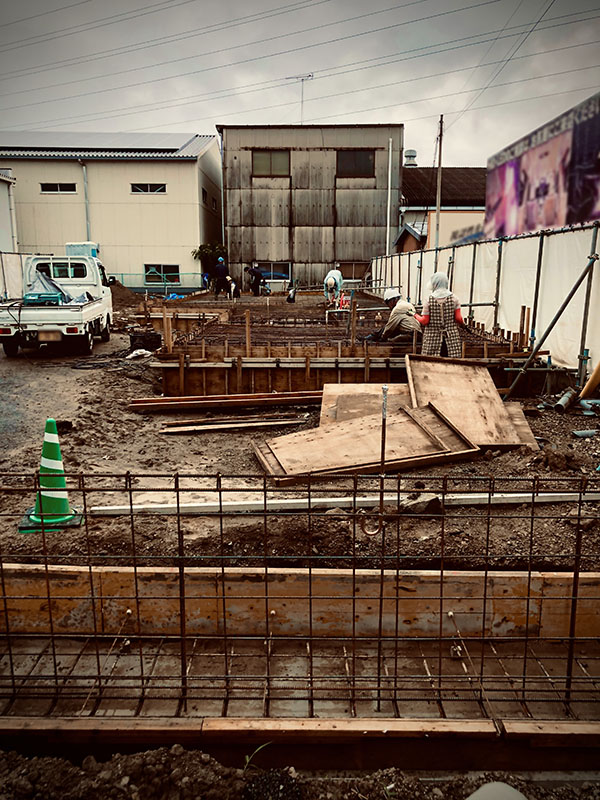 梅雨に入って小雨の中、コンクリート打設に間に合わせるように一生懸命頑張っていました。